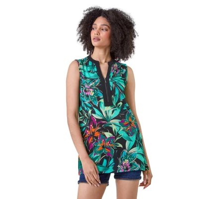 Sleeveless Tropical Print Zip Top from Roman. Stand out from the crowd in this statement contrast leaf print top! This v neck piece features a functional feature zip and is designed in a Summer-ready sleeveless style. Cut from a comfortable stretch jersey fabric this top is finished with a flattering curved hemline. Easily dressed up or down, style with our cropped stretch trousers or relaxed denim jeans for effortless Summer style!