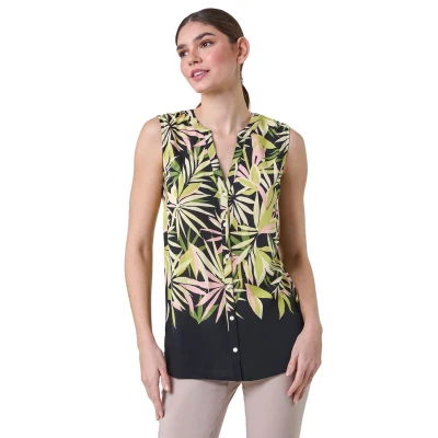 Sleeveless Leaf Print Blouse from Roman. Have fun with tropicals this season with our vibrant leaf print blouse. Cut from a smooth woven fabric, this top features a feminine notch neckline and is designed in a Summer-ready sleeveless style. Adorned in a bold palm leaf print, this piece has sweet button detail at the front for the perfect finishing touch. Pair with cropped trousers and sandals for a day of sightseeing in the city then simply add a lightweight denim jacket for dinner!