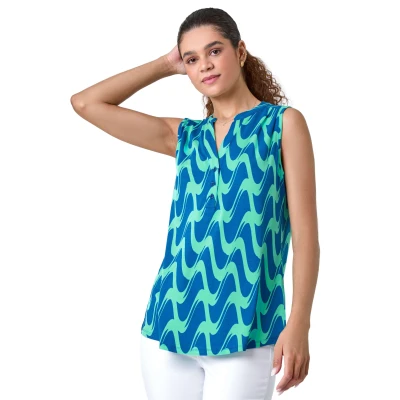 Wave Print Button Sleeveless Top from Roman. Sophisticated sleeveless styles are a certain Summer staple and this bold, abstract piece adds interest with its unique wave print. Cut from a stretch jersey fabric this top is designed in a sleeveless style and features a feminine notch neckline, finished with simple button detail. A colourful contrast print adorns the piece to create a striking look. Add shorts and sandals for the perfect Summer holiday outfit!