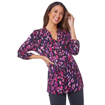 Abstract Animal Longline Stretch Tunic from Roman. This abstract animal print tunic is the perfect addition to your casual wardrobe. Adorned in all over abstract animal print this top is cut from a stretch jersey fabric in a flattering longline cut. A feminine notch neckline, 3/4 length tab sleeves and front button detail add further interest. Pair with mom jeans and boots for a casual but chic day look!