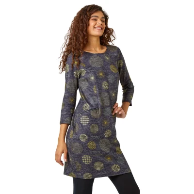 Spot Print Shift Stretch Dress from Roman. Keep your Winter wardrobe spot-on with this abstract, spot-print, shift dress. Cut from a woolly-touch stretch jersey fabric, this cosy piece is ideal for the cooler season ahead. It features a modest round neckline and playful 3/4 sleeves. It boasts practical zip pockets and an eye-catching spot print throughout. Ideal for work to weekend wear, simply add tights, boots and a fluffy gilet for an on-trend Autumn look!