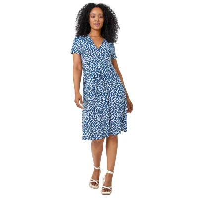 Petite Spot Print Stretch Wrap Dress from Roman. Simple and sweet, this petite spot print wrap dress is a must have wardrobe staple. Cut from a comfortable stretch jersey fabric this dress features a feminine v neckline, created by its wrap bodice and simple short sleeves. A pleated, elasticated waist provides a secure but comfortable fit. It falls to a knee length in a flattering fit and flare style. Adorned in an abstract spot print this piece features fun pocket detail. Pair with heeled wedges for an instant Summer look!
