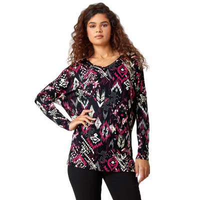 Aztec Print Tunic Stretch Top from Roman. Embrace the allure of our Aztec print with this tunic stretch top. Cut from a comfortable stretch jersey fabric, this top features a subtle v-neckline and fun cosy full-length sleeves. Adorned in an intricate Aztec print this piece adds pattern to your everyday wardrobe with ease. Pull on overhead for quick and easy dressing and add relaxed denim and boots for a stylish, everyday look!