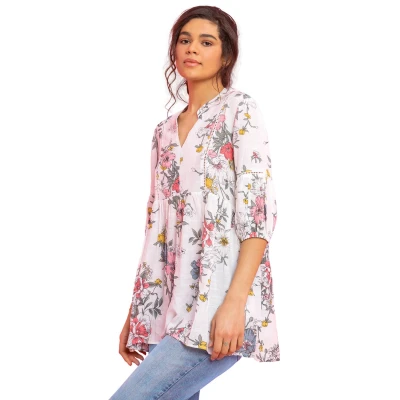 Floral Print Notch Neck Top from Roman. Get your boho on with relaxed silhouettes and comfortable fits this season. Cut in a smock shape with a notch neckline, this 3/4 length top has elasticated cuffs and a delicate tape detail to the arms and bodice. For a casual look pair with leggings and pumps or pack this in your holiday suitcase and add shorts and sandals for a beach babe style.