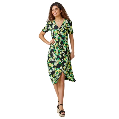 Ditsy Floral Ruched Sleeve Midi Dress from Roman. Adorned in a fun floral print, this woven midi dress is perfect for the warmer months. Designed with a feminine v neckline this piece features short, ruched sleeves and sweet button detail. A thick waistband creates flattering pleats throughout the dress. Designed to pull on overhead, this dress falls in a fit and flare style to its midi length hem. Pair with heeled wedges to complete the look!