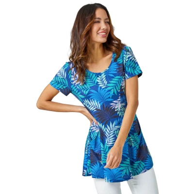 Palm Print Pocket Tunic Stretch Top from Roman. Add some fun tropical prints to your everyday collection with this palm print tunic top! Cut from a stretch jersey fabric, this top features a modest round neckline and simple short sleeves. A bright, palm print adorns the piece, while pocket detail adds a playful yet practical edge. Designed in a relaxed tunic shape this top is perfect paired with cropped jeggings and trainers!