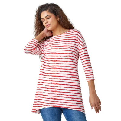 Abstract Stripe Print Stretch Top from Roman. Stripe it lucky this Spring with our newest casual top. Keeping the warmer weather in mind, this striped top is cut from a lightweight stretch jersey for a comfortable style that’s designed for all day wear. It has a modest round neckline, 3/4 length sleeves and a playful hanky hemline that makes it great for transitioning into the new season. A broken stripe print adds a new twist to the timeless nautical trend. Wear with jeans and trainers for the perfect Summer day style.