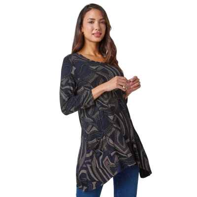 Swirl Print Hanky Hem Stretch Top from Roman. Earn some serious style points this season with this abstract print tunic top. Cut from a stretch jersey for a comfortable and flexible fit, this classic tunic is detailed with 3/4 length sleeves, a modest round neckline and a feminine hanky hemline. For further detailing the garment features some patch pockets. Pair with faux leather trousers for a comfortable yet stylish Autumn, Winter daytime look.