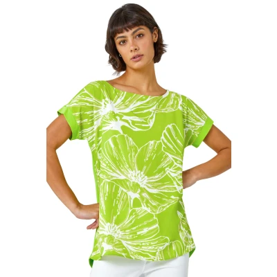 Linear Floral Print Stretch T-Shirt from Roman. This simple shape is set apart with its intricate, linear floral print. Cut from a comfortable stretch jersey fabric this piece features a contrasting woven front, offering difference and interest in texture. It boasts a modest round neckline and simple short sleeves. Made for quick and easy dressing this piece is perfect paired with stretch shorts and sandals for an everyday ensemble!