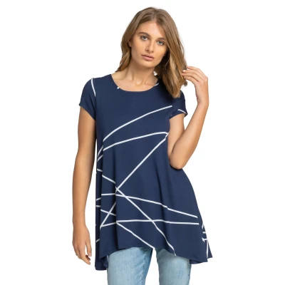 Linear Print Hanky Hem Top from Roman. Finished with a linear puff print in an abstract design, this longline jersey top is perfect for those day to night occasions. Our everyday staple has a comfy t-shirt silhouette with short sleeves and a crew neck. Dress it up with the addition of a long necklace and jeans with heels or boots. Effortlessly stylish, this light hanky hem silhouette is perfect for packing in your holiday suitcase and wearing casually all year long.