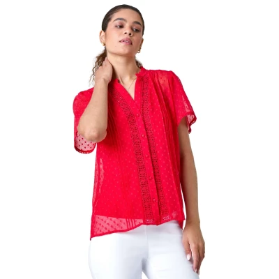 Roman Originals Textured Spot Lace Trim Blouse for Women UK Ladies Everyday Holiday Spring Summer V Neckline Comfy Soft Evening Vacation Work Party Red Size 14
