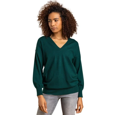 Roman Originals V Neck Jumper for Women UK Ladies Boyfriend Fit Slouch Sweater Winter Autumn Textured Casual Flattering Knit Pullover Knitwear Daywear Lightweight Lounge Dark Green Size 20