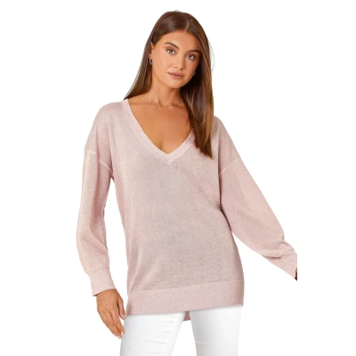 Relaxed Stretch Shimmer V-Neck Jumper from Roman. Our classic relaxed jumper shape has had a festive makeover! This relaxed boyfriend jumper features a flattering v-neckline and full-length blouson sleeves finished with ribbed cuffs. A banded ribbed hem provides a secure fit and flattering shape throughout. Adorned in a subtle shimmer this jumper is perfect for elevating your everyday style. Pair with leather trousers and heels for a casual yet Christmas-ready look!