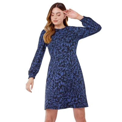 Roman Originals Women Animal Print Jacquard Dress Ladies Autumn Everyday Winter Holiday Pull On Round Neck Long Sleeves Comfy Soft Vacation Work Midnight Blue Size 20