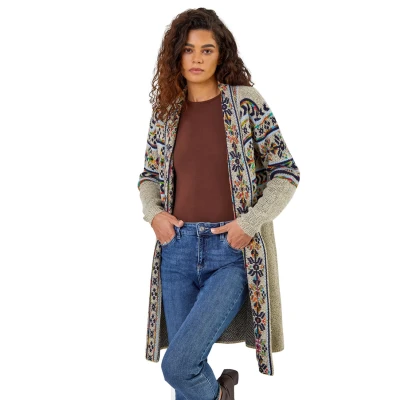 Nordic Patterned Longline Cardigan from Roman. Make a statement in this nordic patterned cardigan. It boasts a printed collar trim and edge to edge opening, this cardigan is perfect for taking your casual looks up a notch. This longline style is cut from a thick mixed knit material that ensures you stay warm during those colder days. Add some heeled boots, jeans and chunky accessories for the perfect pumpkin patch look!