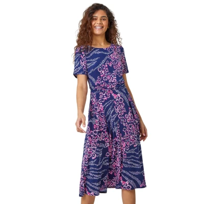 Secret SalesTextured Animal Print Stretch Dress from Roman. Take a walk on the wild side in style with this puff print stretch dress. Cut from a comfortable stretch jersey fabric, this piece features a modest round neckline and simple short sleeves. Adorned in a striking, mixed animal print this dress boasts a flattering gathered waistline and practical side pockets. The skirt falls in a fit and flare style to an everyday knee-length. Wear with courts for work for the perfect smart casual look!