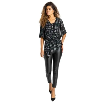 Adorned in an all-over polka dot foil print, this v-neck wrap top is finished with fluted sleeves a round ring necklace and an asymmetic hem. Made from a floaty chiffon material with an inner vest, add some sparkle and go dotty for this essential party blouse. This sparkly style will be a pretty addition to your eveningwear for the party season and beyond. The length of this top is approx 50cm. Please click our store link to visit the Roman shop and see our entire range.