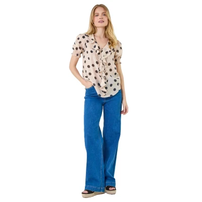 Polka Dot Frill Front Shirred Top from Roman. Our frill detail polka dot top is here to add a new twist to your Spring wardrobe! The perfect smart casual blouse for any occasion, this light woven top is finished with a spot print and shirred stretch cuffs for ultimate comfort. Featuring a flattering v-neckline and short sleeves, this piece showcases a pretty frill detail for added charm. Pair with denim jeans and heels for effortless day to night dressing.