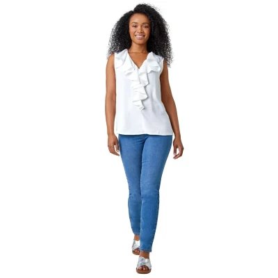 Roman Originals Women Frill Front Vest Top Ladies Ruffle Blouse Summer Spring Special Occasion Evening Holiday Cruise Cocktail Party Short Long Sleeve Sleeveless V Neck Petite White Size 14