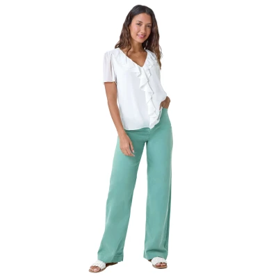 Crinkle Textured V-Neck Frill Detail Top from Roman. Step into summer with this intriguing textured top! Made from a lightweight woven fabric, this top features a flattering v-neckline and short sleeves, complete with flattering shirred frilled cuffs. The frilled front adds a playful flair to this top, while the crinkle fabric adds an interesting texture. Pair it with denim shorts and wedges for a casual yet chic daytime ensemble.