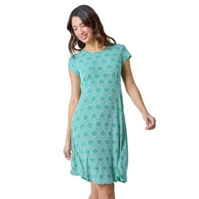 Secret SalesMosaic Puff Print Gathered Dress from Roman. Introducing our texture mosaic print dress - a perfect choice for the Summer season. This dress features a classic round neckline and short sleeves for a timeless appeal. The all-over print adds a playful touch, and cut to a knee length, it's both stylish and versatile. Crafted from comfortable jersey fabric, it guarantees a relaxed yet chic look. With no fastening needed, slip into effortless style. Complete your ensemble with espadrilles and a stylish handbag for a casually elegant outfit that transcends age.