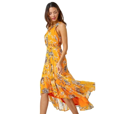 Roman Originals Women Halter Neck Frill Midi Dress Ladies Special Occasion Evening Party Wedding Guest Print Ruffle Detail Sleeveless Round Dresses Warm Yellow Size 20