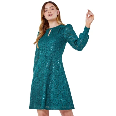 Roman Originals Women Lace Sparkle Swing Dress Ladies Spring Holiday Summer Long Sleeves Vacation Evening Smart Casual Work Round Neck Green Size 8