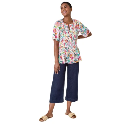 Floral Crinkle Blouse from Roman. Delve into the ditsy floral trend with our newest Spring addition. This notch neck button detail piece has a feminine frill at the hem that really elevates this casual piece. Relaxed short sleeves are great for keeping you cool in the summer, whilst the stretchy shirring around the body is so accommodating for the bigger bust. Opt for classic denim jeans and white sandals with this crinkle top for a look that will see you through the season.