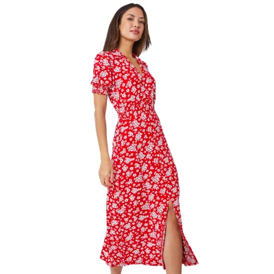 Ditsy Floral Print Fit & Flare Dress from Roman. This collared dress just oozes nostalgic summer vibes complete with an all-over ditsy floral print. Created with relaxed shirt collar and flattering v-neckline. A light and easy style made with short elasticated sleeves and a shirred waist line, this gorgeous fit and flare style is complete with a central split. Pair this pretty dress with a white bag and sandals or sneakers for a relaxed yet effortless look.