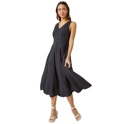 Roman Originals Women Textured Stripe Button Detail Midi Dress Ladies Spring Everyday Summer Holiday Sleeveless Soft V Neckline Comfy Empire Frock Vacation Gowns Black Size 16