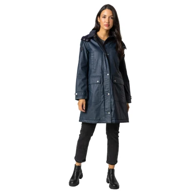 Roman Originals Women Waxed Coat with Hood Ladies Hooded Winter Jacket Pockets Autumn Long Longline Rainproof Windproof Showerproof Everyday Evening Work Smart Casual Navy Size 18