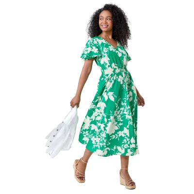 Roman Petite Womens Leaf Print Shirred Midi Dress Green Size 14 UK