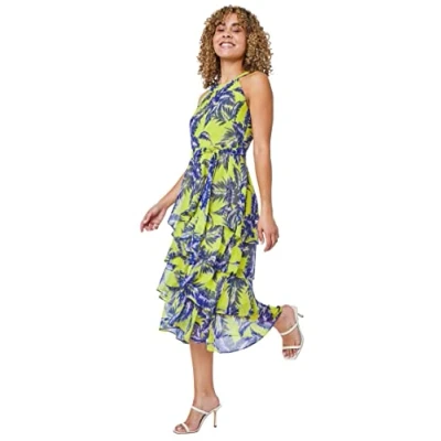 Roman Petite Womens Tiered Tropical Print Midi Dress Lime Green Size 18 UK