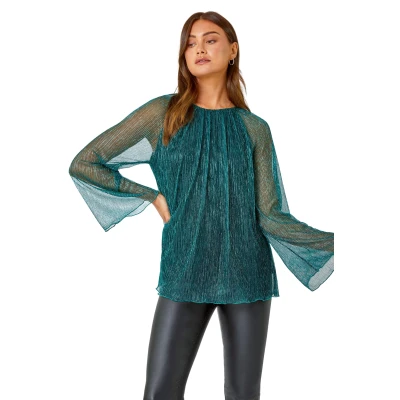 Plisse Overlay Wide Sleeve Top from Roman. Party all night in this plisse top! Cut from a glistening shimmer fabric, this top features a modest round neckline and extravagant wide sleeves to create a playful yet sophisticated style. Designed with a fitted underlay to keep you covered this top features a flirty keyhole cutout that accentuates the button fastening at the back of the neck. Pair with faux leather trousers and strappy heels and you’re sure to be the star guest at all of this season's parties!