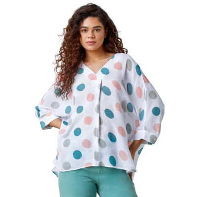 Polka Dot Print Pleat Front Top from Roman. Set sail for Summer in an easy breezy relaxed fit number! Crafted from a light woven material in a floaty fit, this v-neck top is complemented by a flattering pleat detail to the front. Styled with 3/4 length button cuff sleeves and a timeless spot print, our newest number is ideal for warm-weather dressing from home to holiday! It also features a dipped hemline with side splits for a loose finish. Update your casual collection by pairing this with denim jeans and sandals.