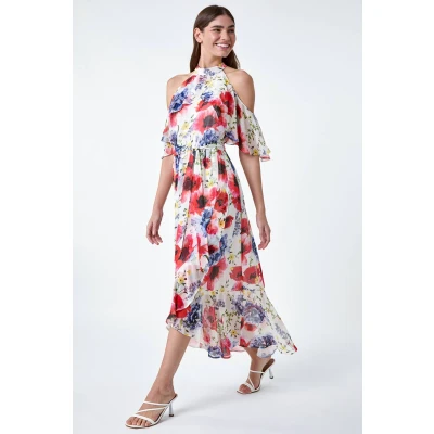 Poppy Floral Frill Halterneck Dress from Roman. Special occasion this season? Look no further than this glamorous chiffon number! Our floral print maxi dress is the most flattering style for any event with its cold shoulder silhouette and frill detail on the sleeves, bust and hem. The fabric tie belt cinches in the waist to create a fit & flare shape with a soft dipped hem and layered finish. A glamorous halter neckline is fastened at the back with a concealed zip and button loop. This fully lined dress is destined for a day at the races or your next wedding invitation - just add a fascinator, clutch and heels and you’re good to go!