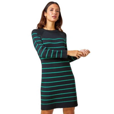 Stripe Print Knitted Jumper Dress from Roman. Step into the colder months in style with this cosy knitted Roman dress. Cut from a soft touch knit, this classic sweater dress has long sleeves, a round neck, ribbed cuffs and a classic stripe print throughout. Our casual dress is the ideal outfit for Autumn walks, pumpkin picking and Christmas markets this year. Keep warm in this relaxed fit style, perfectly paired with some thick tights and ankle boots for the Autumn Winter season.