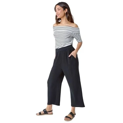 Roman Textured Cotton Culotte Trousers for Women UK Ladies Spring Everyday Summer Holiday Elasticated Waist Comfy Patch Pockets Soft Wide Leg Daywear Vacation Bottoms Black Size 12