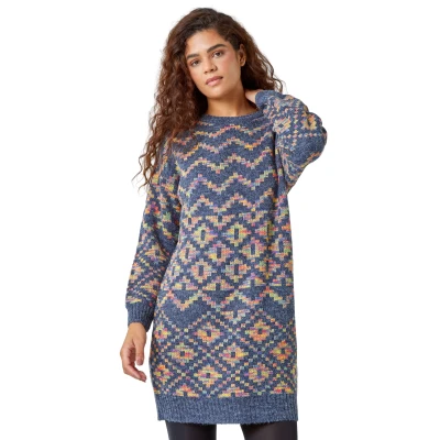 Geometric Print Jacquard Jumper Dress from Roman. Step into the colder months in style with this colourful knitted Roman dress. Cut from a soft touch wool, this classic jumper dress has long cuffed sleeves, a relaxed round neck and a jacquard geometric print. Our casual cosy dress is the ideal outfit for Autumn walks, pumpkin picking and Christmas markets this year. Keep warm in this relaxed fit dress, perfectly paired with some thick tights and chunky boots for the Autumn Winter season.