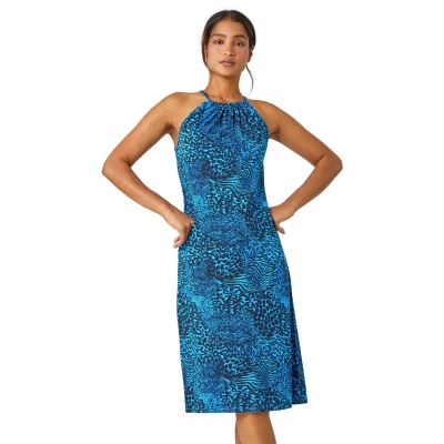 Animal Print Halter Neck Stretch Dress from Roman. Take a walk on the wild side with this colourful, animal print, swing dress. Cut from a comfortable, stretch jersey fabric, this dress features a pleated round neckline and is designed in a sleeveless, sun-ready, halter neck style. Adorned in a wearable animal print this piece is cut in a flattering and free swing shape. Designed to pull on overhead this piece is a holiday must have. Pair with sandals and a lightweight jacket for long days exploring new cities or wear for casual sunset dinners with family!