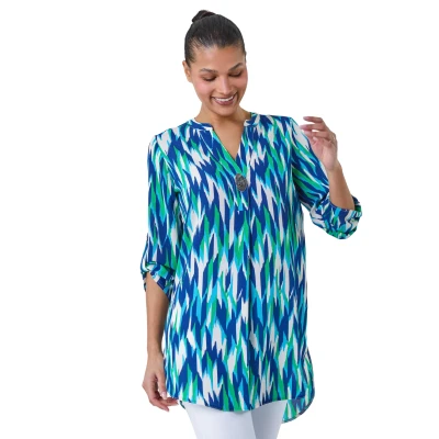 Secret SalesAbstract Longline Button Detail Tunic Top from Roman. A sure-fire way to inject some print into your looks, this longline tunic top is sure to turn heads with its contrasting abstract print. Featuring 3/4 length sleeves, a flattering notch v-neck and a statement shiny button, this top is halfway between smart and casual. Dress it up or down to suit your occasion. This timeless blouse can be paired with cropped trousers to really make a statement or toned down with a blazer and trousers for work.