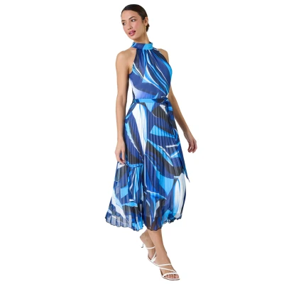 Secret SalesAbstract Print Pleated Chiffon Midi Dress from Roman. Elevate your style with our fabulous pleated midi dress, a perfect pick for Summer occasions. Featuring a chic halter neckline and sleeveless design, this dress exudes timeless elegance. The pleated skirt and belt detail add a touch of sophistication to your ensemble. Crafted from a woven fabric with a stunning print, it ensures a standout look. The concealed zip fastening and midi length make it a must-have for any age group. Pair it gracefully with heels and a clutch bag for a flawless, occasion-ready outfit.