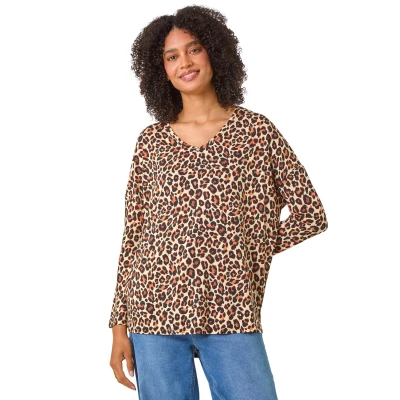 Roman Womens Animal Print V Neck Tunic Stretch Top Beige Size 16 UK