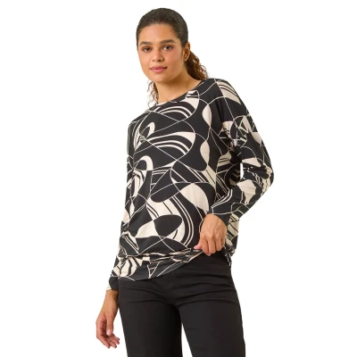 Banded Geometric Stretch Top from Roman. Add a touch of glamour to your Autumn/Winter wardrobe with this chic geo print top. Cut in a hip-length style from stretchy jersey fabric, this top features a round neck and banded hem for a flattering fit. The long sleeves offer extra warmth while the standout feature is the bar back detail with a V at the back neck, adding a stylish twist. The all-over geo print gives a modern edge to this versatile piece. Pair with jeggings and ankle boots for a trendy and comfortable look!