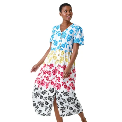 Secret SalesColourblock Floral Button Tiered Dress from Roman. This contrast floral Summer dress is here to elevate your casual collection. Cut to a relaxed silhouette and fastened with a full button opening, this midi length dress boasts a colour block floral print with a gathered waistline for a flattering fit. It features a trendy split detail, short sleeves and a v-neckline to finish. To complete your Springtime style, pair this with sandals and a denim jacket, a look that's calling for a beer garden get-together with friends.