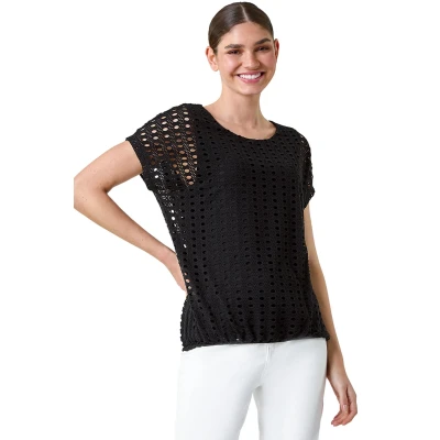 Cut Out Detail Stretch Top from Roman. Introduce abstract prints to your Summer wardrobe with this unique Roman top! Crafted from super soft stretch jersey, this top offers both comfort and style. The short sleeves and round neckline provide a classic silhouette, while the elasticated bubble hem adds a touch of femininity. The highlight of this piece is the laser-cut-out spot overlay, which adds an eye-catching unique touch to the piece. Complete with a stretch jersey lining, this top is perfect for pairing with cropped trousers and sandals for a chic daytime style.
