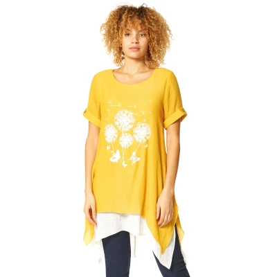 Dandelion Floral Hanky Hem Tunic Top from Roman. Update your Spring casual-wear with this versatile wardrobe staple. Featuring a floral dandelion print and contrast asymmetric hemline, this tunic top is made from an easy breezy lightweight material. The short sleeves are finished with a delicate button detail whilst the flattering hanky hem silhouette is brilliantly flattering on all. Throw this over your favourite cropped trousers for a Summer holiday or jersey leggings for an everyday go-to style.