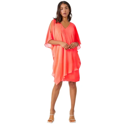 Roman Womens Embellished Cold Shoulder Overlay Dress Coral Size 10 UK