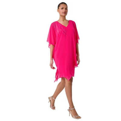 Secret SalesEmbellished Cold Shoulder Overlay Dress from Roman. Add a sense of timeless class to your wardrobe with this embellished overlay dress. Cut from a lightweight chiffon, the asymmetric overlay falls effortlessly to create a glamorous silhouette, pulled together by a floaty split sleeve and v-neckline. Detailed with sparkle hotfix embellishment, this funky piece oozes evening elegance. Pair with strappy heels for instant glamour at your next special occasion.