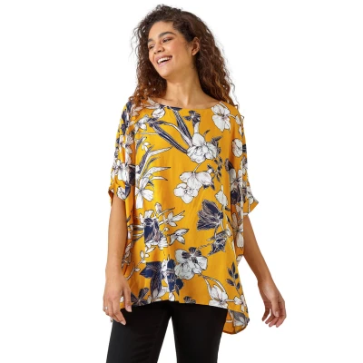 Floral Print Button Back Top from Roman. Add a light layer to your spring summer wardrobe with this short sleeve relaxed fit tee. Cut from a soft on the skin fabric, this boxy fit top is perfect for throwing on over your casual looks this season. Our large floral print top is finished with fabric covered buttons all down the back for added interest. Opt for white cropped trousers and sandals for your holiday ready ensembles.